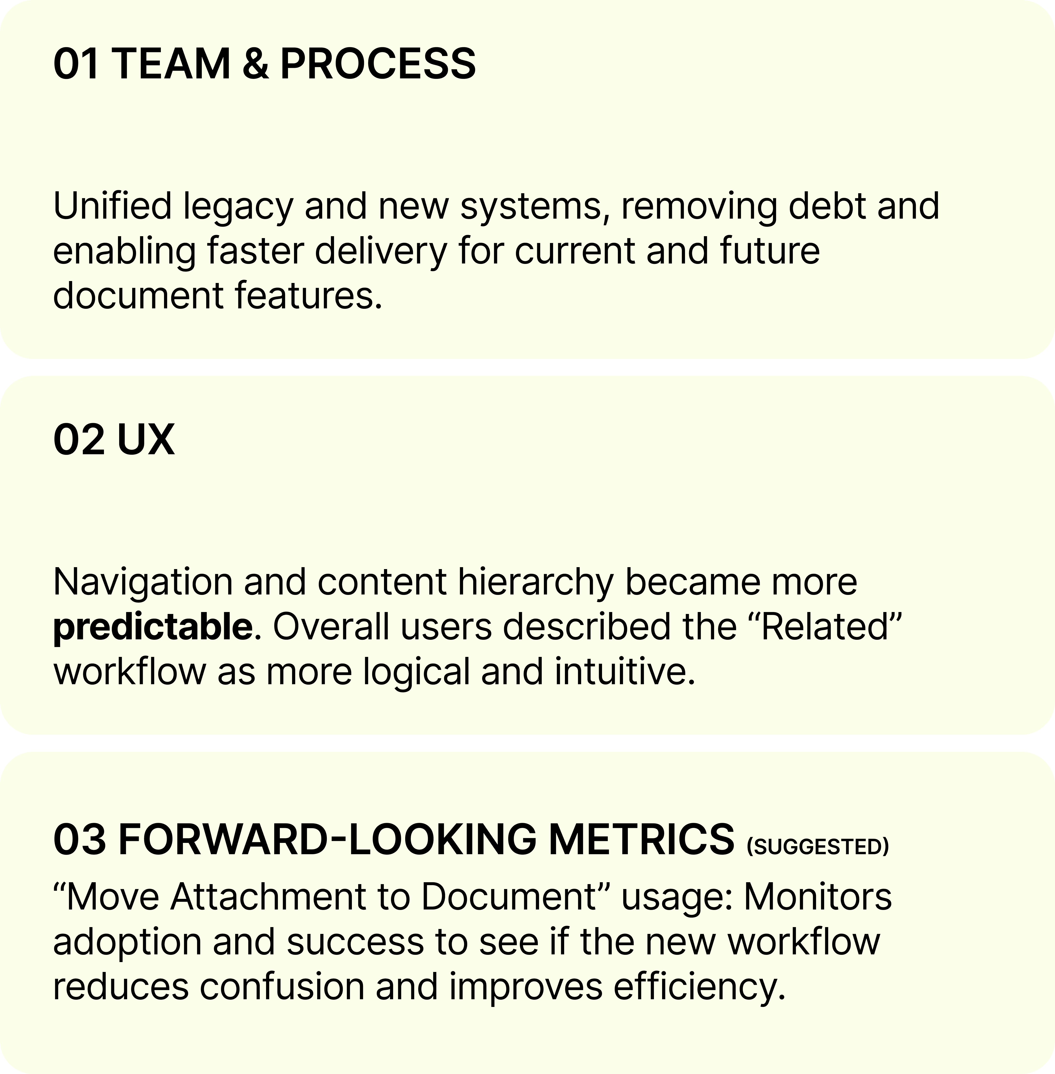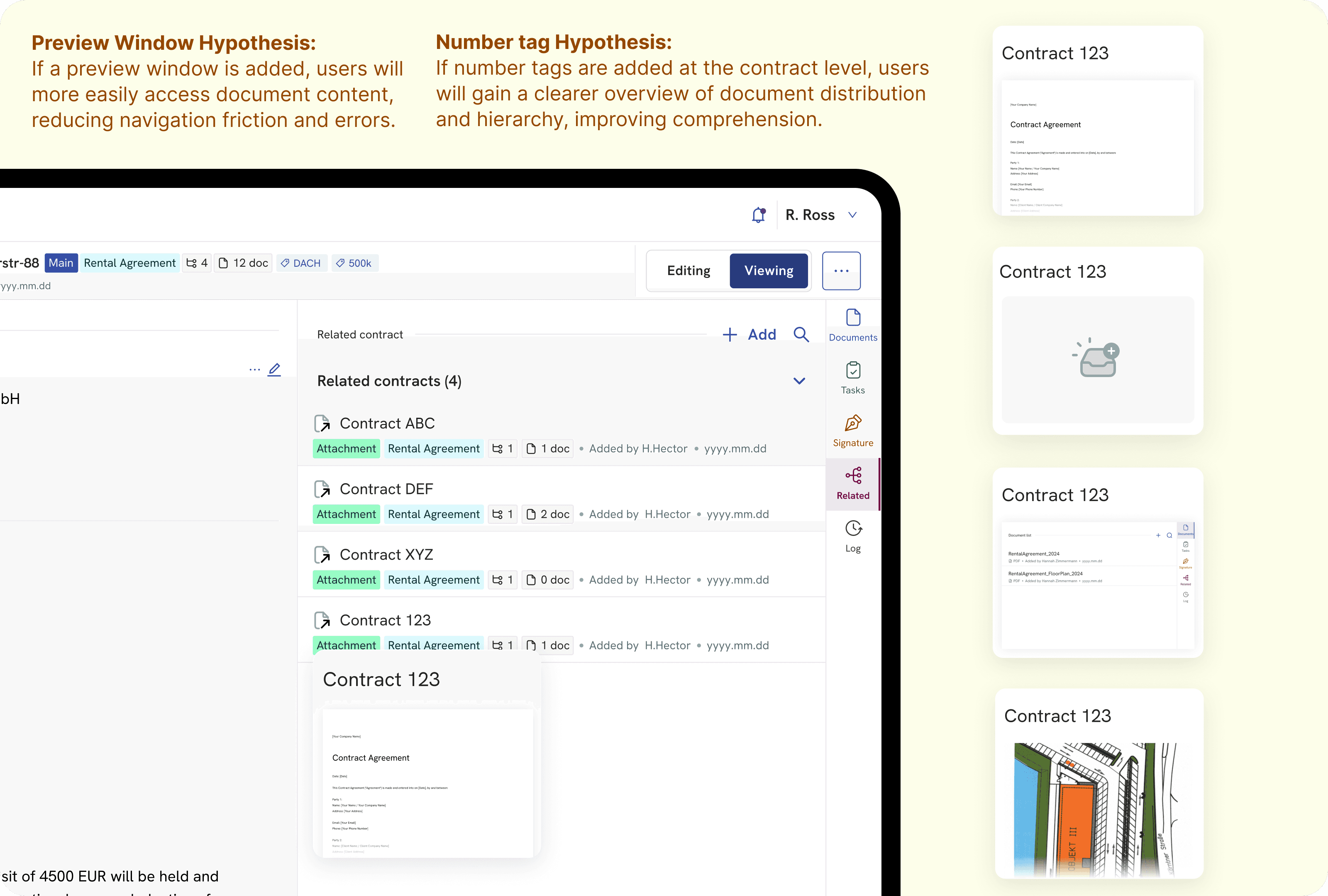 The new "Related Contracts" tab successfully increased clarity for new users. Yet, the change created a new tradeoff: longtime users missed the quick "hack" they used to peek at content via the previous dropdown menu.